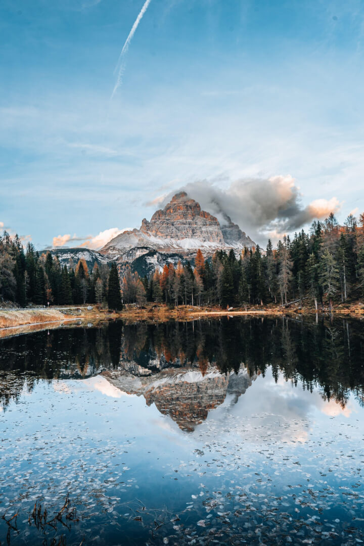 Autumn colours of Lake Lago d'Antorno and bridge in Dolomites Italy